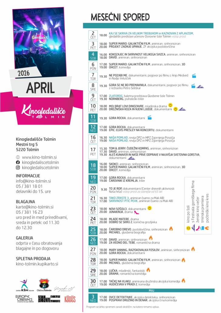 Blagajna: (05) 381 16 23 (uro pred in med plačljivi dogodki ter sreda in petek med 11:30 in 12:30), karte@kino-tolmin.si // Informacije: (05) 381 18 01 (med delavniki od 9:00 do 15:00), info@kino-tolmin.si